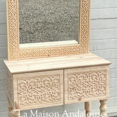 Magnifique coiffeuse et miroir sculptée en pin 2 tiroirs à patiner.Dimensions : 78x42h80.Miroir 70x80.