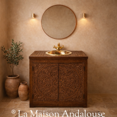 Ce meuble de salle de bain révèle toute la noblesse du travail artisanal marocain. Son décor finement sculpté, inspiré des motifs andalous, transforme l’espace du quotidien en un véritable lieu de sérénité et d’élégance.