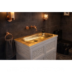 Ce meuble vasque marie avec élégance la noblesse du métal martelé aux lignes douces d’un mobilier sculpté avec finesse. Chaque détail évoque le savoir-faire artisanal, la matière travaillée avec patience.