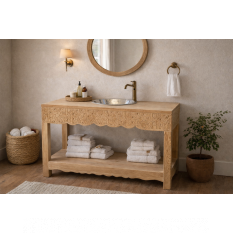 Offrez à votre salle de bain une atmosphère douce, chaleureuse et profondément authentique. Ce meuble en bois naturel, délicatement sculpté à la main, évoque le savoir-faire artisanal et la beauté des matières brutes. Ses lignes épurées, sublimées par des motifs finement travaillés, apportent une touche d’élégance discrète qui transforme l’espace en véritable havre de bien-être.