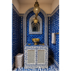 Magnifique meuble de salle de bain pour vasque à poser zouak assortie au zellige qui recouvre le plan. Coloris du zellige aux choix.Meuble présenter dimension 80cmx50cm, zellige triangle bleu outremer.Prix meuble +vasque+robinet carré martelé et porte savon. Meuble uniquement 990 euros