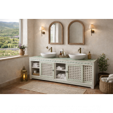 Meuble de salle de bain 2 portes moucharabieh et 3 étagères ouvertes.