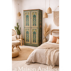 Armoire deux portes en zouak vert qui apportera de la douceur à votre pièce. Peut être réalisée sur mesure et dans une autre couleur.