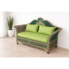 Très belle banquette en bois et zouak vert avec matelas et coussins.