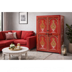 Armoire deux portes en zouak rouge qui donnera de l'éclat à votre salon. Peut être réalisée sur mesure et dans une couleur différente.