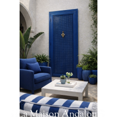 Porte moucharabieh peinte bleu Chefchaouen.Nous vous proposons different