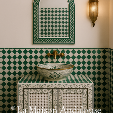 Magnifique meuble de salle de bain Zouak avec vasque à poser céramique de Fès contour or , zellige qui recouvre le plan.Meuble présenter dimension 80cmx50cm.Prix comprenant le meuble est la vasque.Prix : 1100