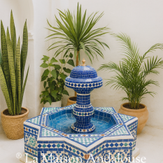 Description Bassin zellige marocain en forme d'étoile sur table équipé de roulettes et de sa pompe en circuit fermé, prêt à l'emploi.Cette fontaine peut être réalisée dans les coloris de votre choix.Dimension pointe à pointe : 94 cm x 94 cm, hauteur bassin 30 cm, hauteur colonne 55 cm.