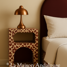 Autre modèle de chevet aux motifs inspiré de l’écriture Koufique. Il apporte une touche graphique forte, parfaitement chic et intemporelle.Un choix idéal pour ceux qui recherchent un meuble unique et raffiné.