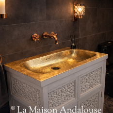 Ce meuble vasque marie avec élégance la noblesse du métal martelé aux lignes douces d’un mobilier sculpté avec finesse. Chaque détail évoque le savoir-faire artisanal, la matière travaillée avec patience.