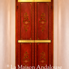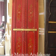 Extraordinaires portes marocaines en bois peint rouge. Portes doubles battants avec décor en trompe l'oeil.
