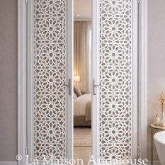 Porte double battante au motif Khéops équipée de charnières va et vient