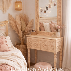 Magnifique coiffeuse et miroir sculptée en pin 2 tiroirs à patiner. Vendue sans le miroir