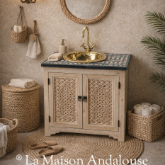 Meuble de sdb porte sculpté, plateau zellige et vasque cuivre compris diamètre 38cm.Robinet non compris