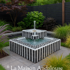 Magnifique bassin à debordement contemporain, exclusivité La Maison Andalouse.Equipée de sa pompe en circuit fermer sur roulette .Base résine .Dimension 101x101, hauteur 1er bassin 35cm, deuxiéme bassin 53cm.