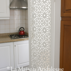 Magnifique porte en claustra Khéops blanche dans une cuisine, ouvert sur l'exterieur alliant modernité et lumiére .Fabrication sur mesure .Nous consulter