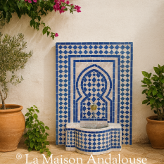 Fontaine murale en zellige sur roulettes. Equipée d'une pompe en circuit fermé. Prête à l'emploi. Dimensions 75 cm x 50 cm. Garantie 2 ans.