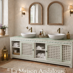 Magnifique meuble en bois peint avec zellige incruster sur le dessus, les portes en moucharabieh coulisse pour un gain de place maximum.Possibilités de sur mesure et de coloris zellige.Modéle dimension L 140cm x P 50cm x H 70cm.Nous consulter